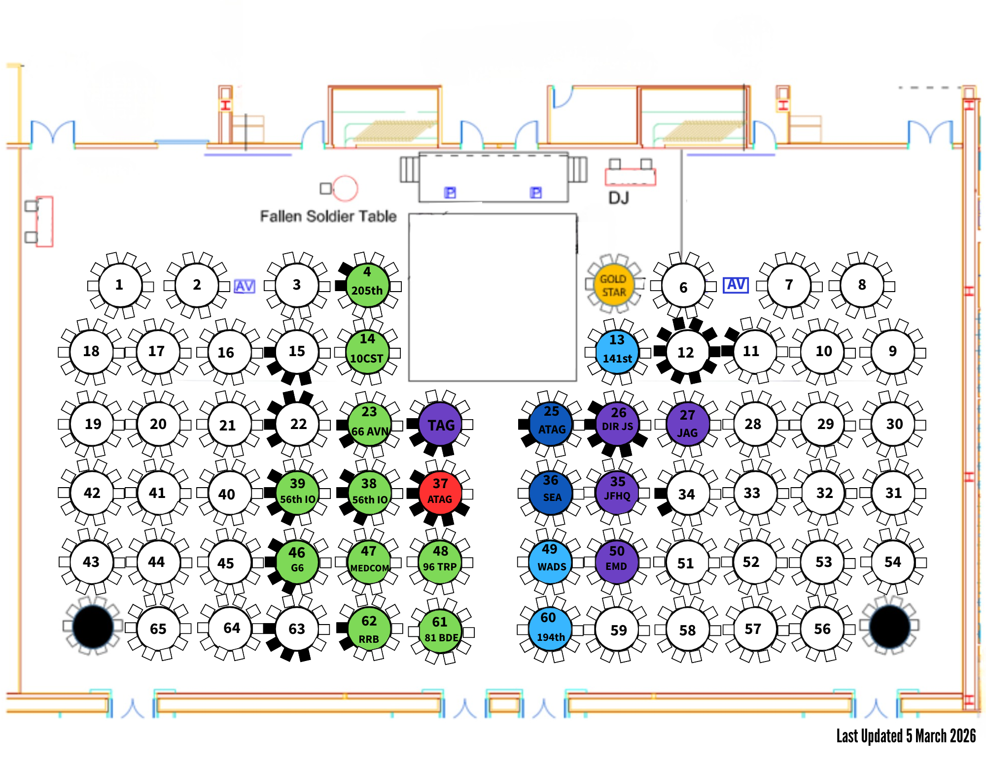 2026 State Conference and Militia Ball Registration This year, the National Guard Association of Washington and the Washington National Guard Militia Ball Committee are joining forces! The NGAW State Conference will be during the day on Saturday, May 16, 2026, followed by the Adjutant General’s Militia Ball in the evening. LOCATION: GREATER TACOMA CONVENTION CENTER 1500 Commerce St Tacoma, WA 98402 Name(Required) First Last Rank(Required)Non-military attendees, please type “Guest”Unit (for seating purposes)(Required)Non-military attendees, please type list the unit you would like to sit with.Branch(Required) Air Army State Guard State Employee Guest Email(Required) Enter Email Confirm Email Guest Name First Last CONFERENCE REGISTRATIONLOCATION: GREATER TACOMA CONVENTION CENTER Conference Rooms 316-317Officer & Warrant Quantity Price: $35.00 Quantity Enlisted Quantity Price: $25.00 Quantity State Employee or Guest Quantity Price: $25.00 Quantity What is your NGAW Affiliation? Member Past NGAW President Former NGAW Board Member MILITIA BALL REGISTRATIONLOCATION: GREATER TACOMA CONVENTION CENTER Ball Rooms A-DCivilian guests should be registered at the same rank price-point as the service member.E1 – E4 Quantity Price: $40.00 Quantity E5 – E7 Quantity Price: $50.00 Quantity E8 – E9 Quantity Price: $75.00 Quantity O1 – O3 and W1 – W2 Quantity Price: $50.00 Quantity O4 – O5 and W3 – W4 Quantity Price: $75.00 Quantity O6 – O8 and W5 Quantity Price: $85.00 Quantity State Employee Quantity Price: $50.00 Quantity Additional Guests' NamesIf you are purchasing tickets for additional guests, please provide their names.Entree SelectionBeefChickenVegetarianPlease tell us your preferred table number from the room layout below, as well as if there are specific people you would like to sit with. Seating assignments are not updated in real-time, therefore we ask that you list at least 2 choices. Blacked out-chairs represent purchased seats.Preferred Table Number(s)Total Credit Card(Required)Card Details Cardholder Name